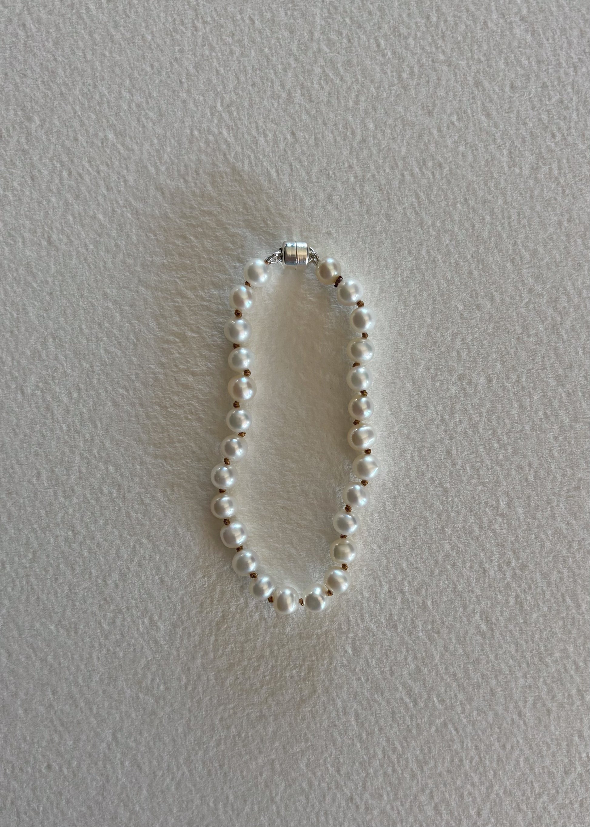 Materials: Freshwater pearls hand knotted on marron silk thread with sterling silver magnetic clasp